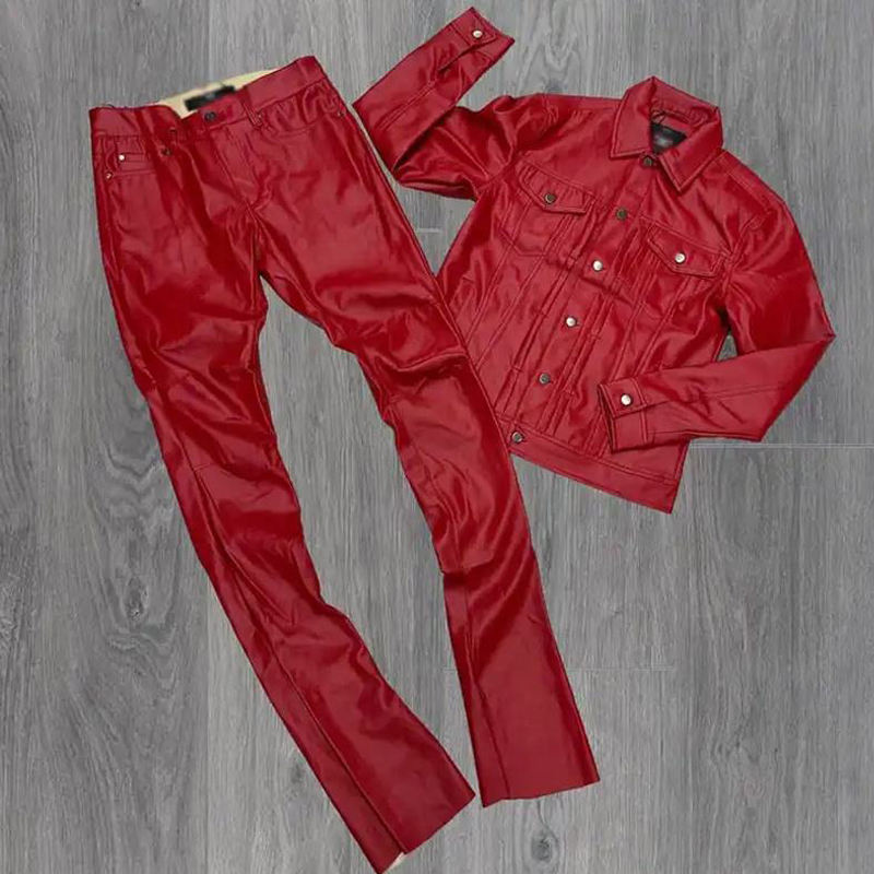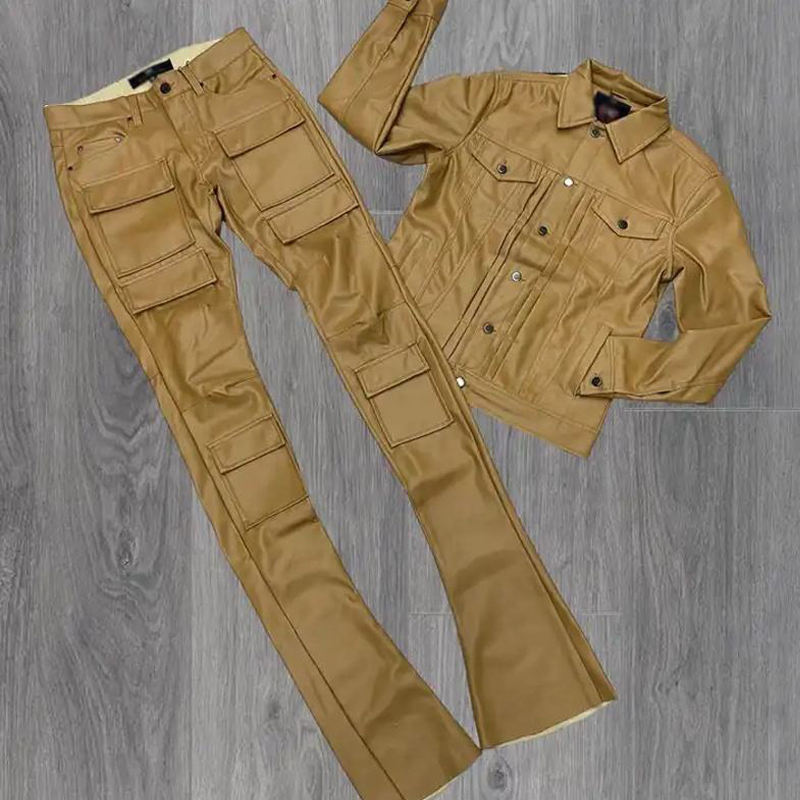 Custom Streetwear Embroidery Zip up PU Leather Shirt and Stacked Flare Pants Two Piece Set Men Leather Tracksuit