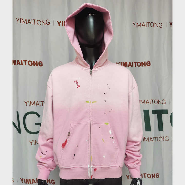 Custom Streetwear Women Men's 500 Gsm Heavyweight Oversized Blank Pink Acid Wash Vintage Ripped Hole Distressed Zip up Hoodie