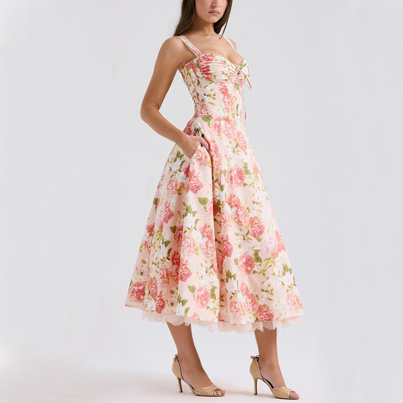 Cinturino aderente personalizzato con stampa in vita morbida Tulle sottogonna con grazioso bordo in pizzo elegante abito Midi in cotone a stampa floreale Bustier
