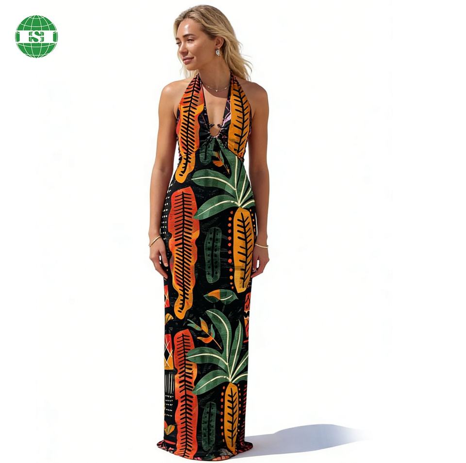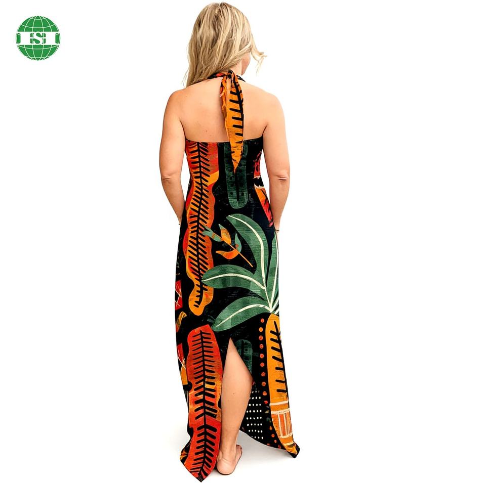 Abito Lungo con Stampa Tropicale Personalizzata, Scollo a V Profondo e Spalline per Donna, con Spacco Posteriore e Tasca Laterale HOUSON FACTORY