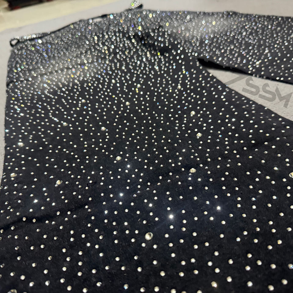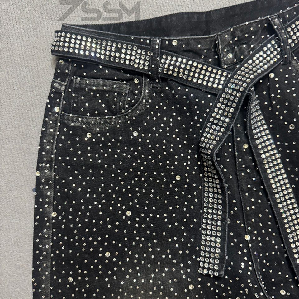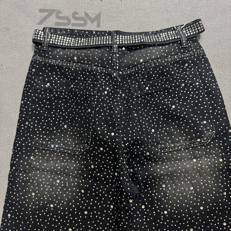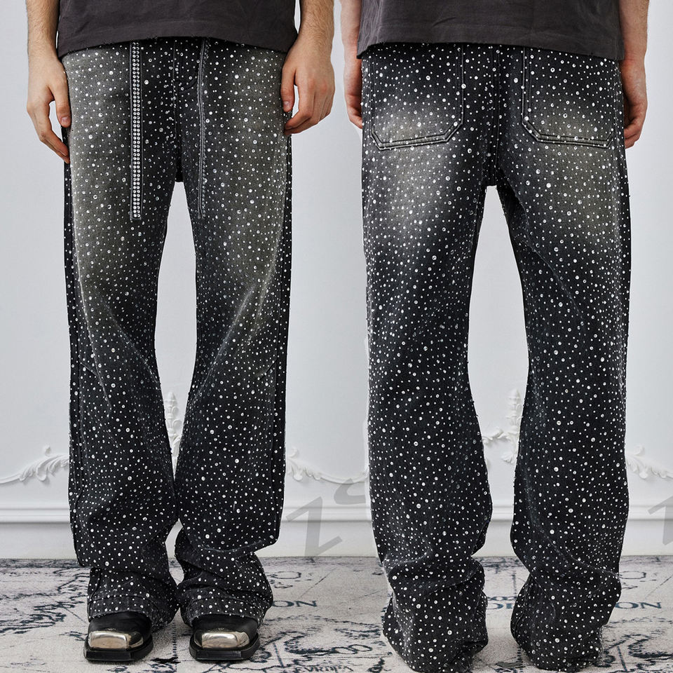 Jeans denim uomo vita alta gamba dritta oversize, lavaggio vintage effetto consumato interamente con strass, MOQ 30-50 pz