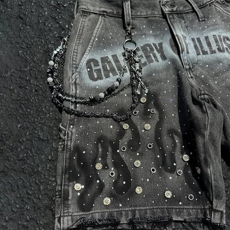 Jeans Corti da Uomo Personalizzati con Stampa sulle Ginocchia, Vestibilità Ampia, Lavaggio Acido, Strass, Pantaloni Baggy in Denim, MOQ10