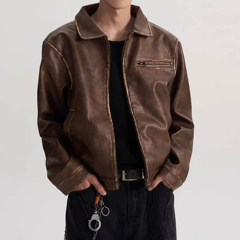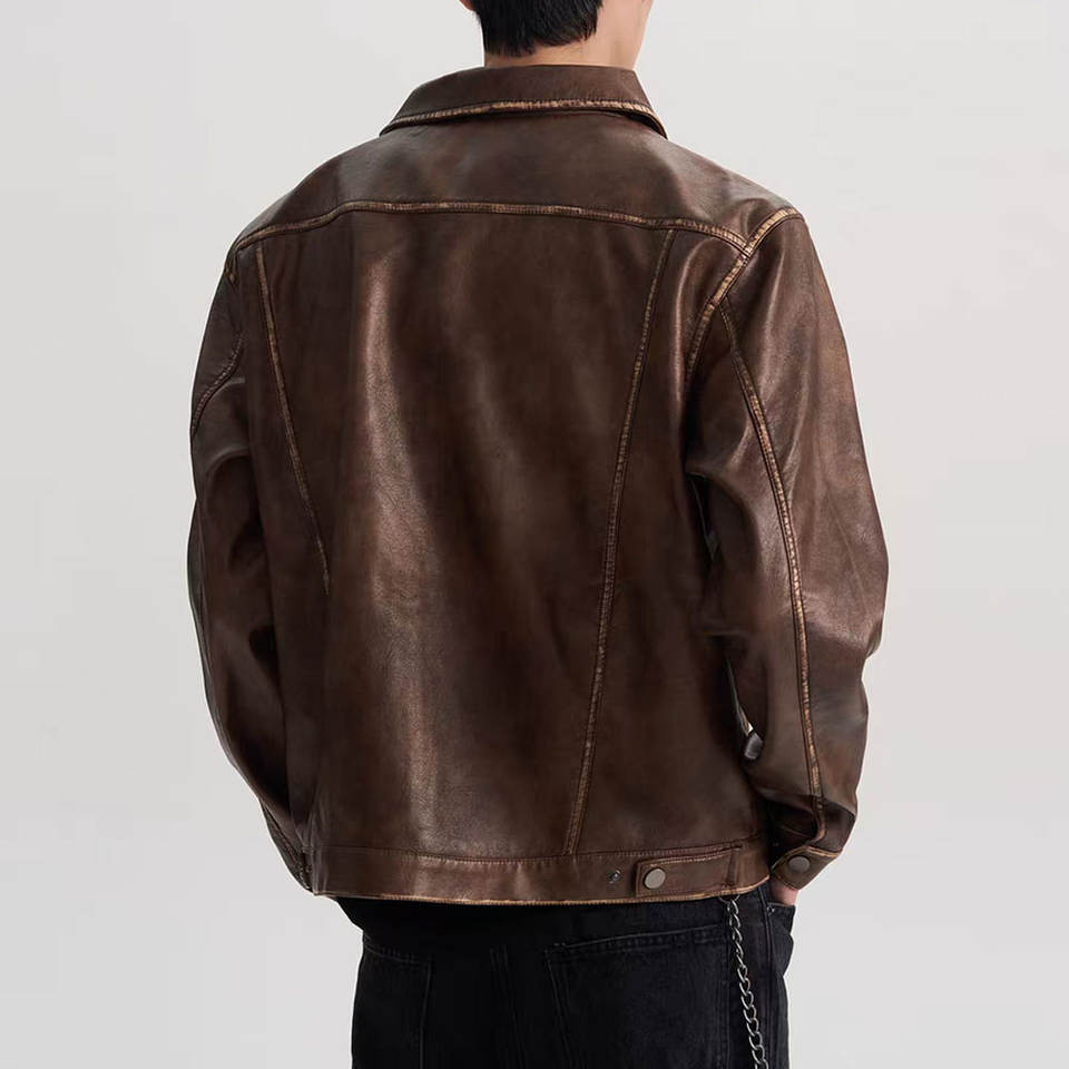 Giacca di Pelle Personalizzata Effetto Lavato, Cappotto in Pelle Sbiadita di Alta Qualità da Uomo con Colletto Classico, Giacca di Pelle Pesante Tie-Dye Effetto Lavato