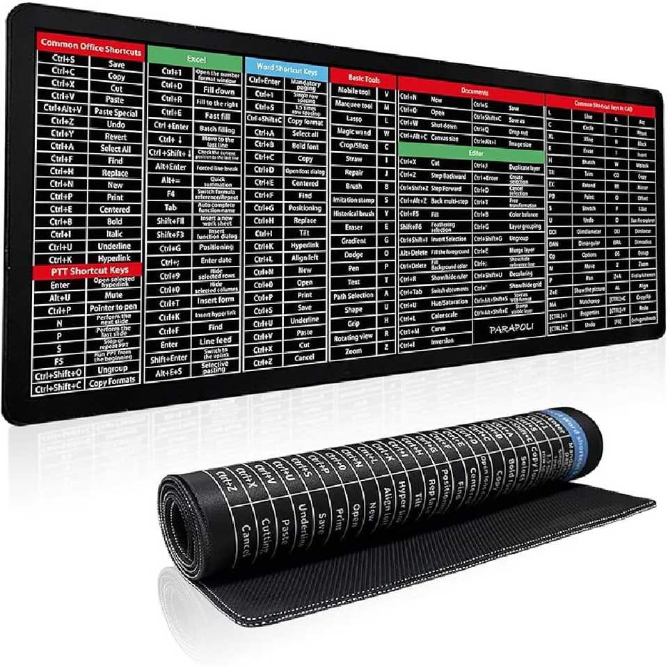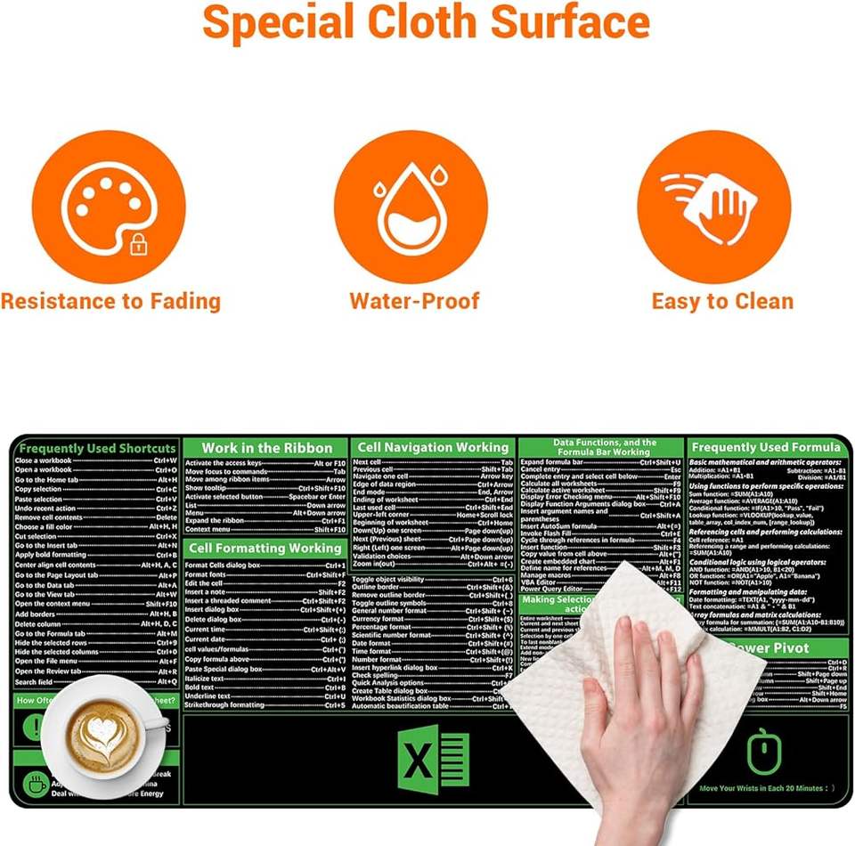 Tappetino per Mouse Personalizzato Impermeabile con Scorciatoie Excel, Antiscivolo con Bordi Cuciti, Extra Large XXL per PC e Ufficio