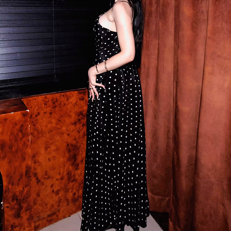 Abito Lungo Elegante a Pois con Spalline Sottili Personalizzato all'Ingrosso, Outfit Femminile alla Moda, Vestiti Eleganti a Linea A per Donne