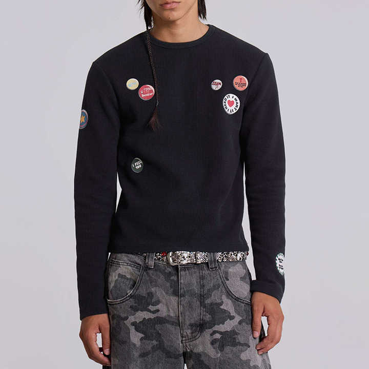 Custom Wholesale Streetwear Black Colorful Badge Patches Screen Printed Cotton Thermal Waffle Knit Long Sleeve Shirt for Men
