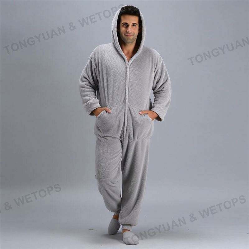 Custom Winter Thick Fleece Jumpsuit Pajamas Mens One Piece Homewear Long Sleeve Hooded Sleepwear