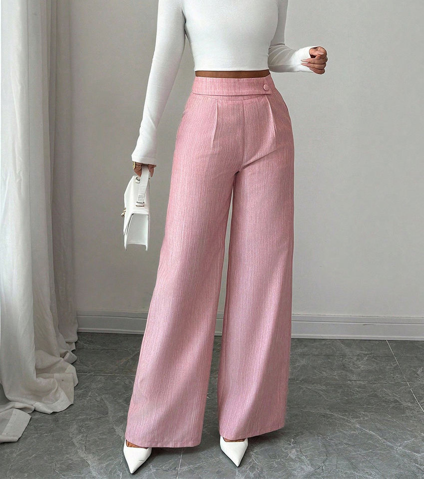 Custom Women High Waist Pink Wide Leg Trousers Wrap Button Waist Elegant Straight Cut Loose Fit Palazzo Pants Factory Wholesale