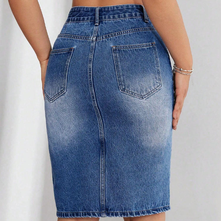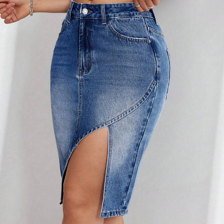Custom Women's High Waist Asymmetric Bodycon Denim Midi Skirt Ripped Cut Edge Hem Featuring Pockets Button Casual Autumn