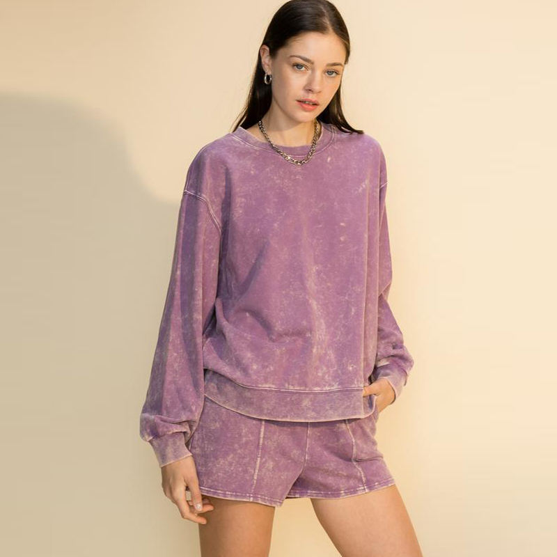 Custom Women's Spring/Summer Acid-Washed Vintage Color Blocking O-Neck Hoodie Above-Knee Shorts Set Casual 100% Cotton Daily