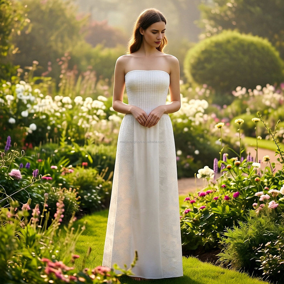 Abito Lungo Bianco in Pizzo Senza Spalline Personalizzato per Donna con Corpetto Arricciato Vestiti Bandeau per Signore
