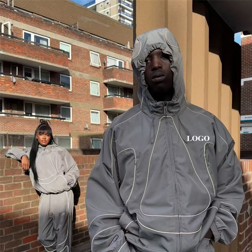 Custom Zipper Sweat Suit for Men Boxy Cropped Nylon Tracksuit No Wrinkle Brown 78% Nylon Reflective Long Short Baggy Windbreaker