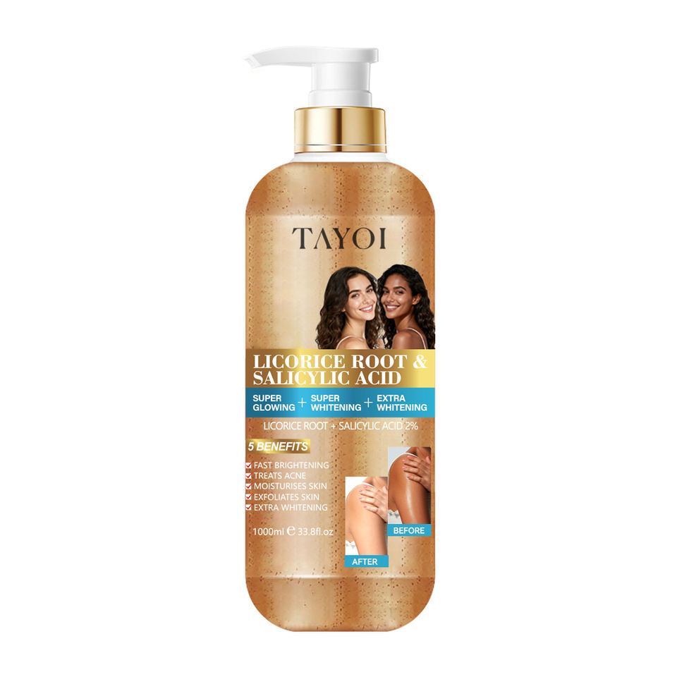 TAYOI Gel doccia scrub schiarente con radice di liquirizia, acido salicilico e estratti naturali per corpo, OEM/ODM MOQ 500 pz