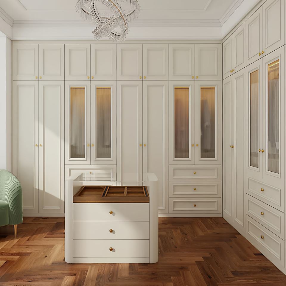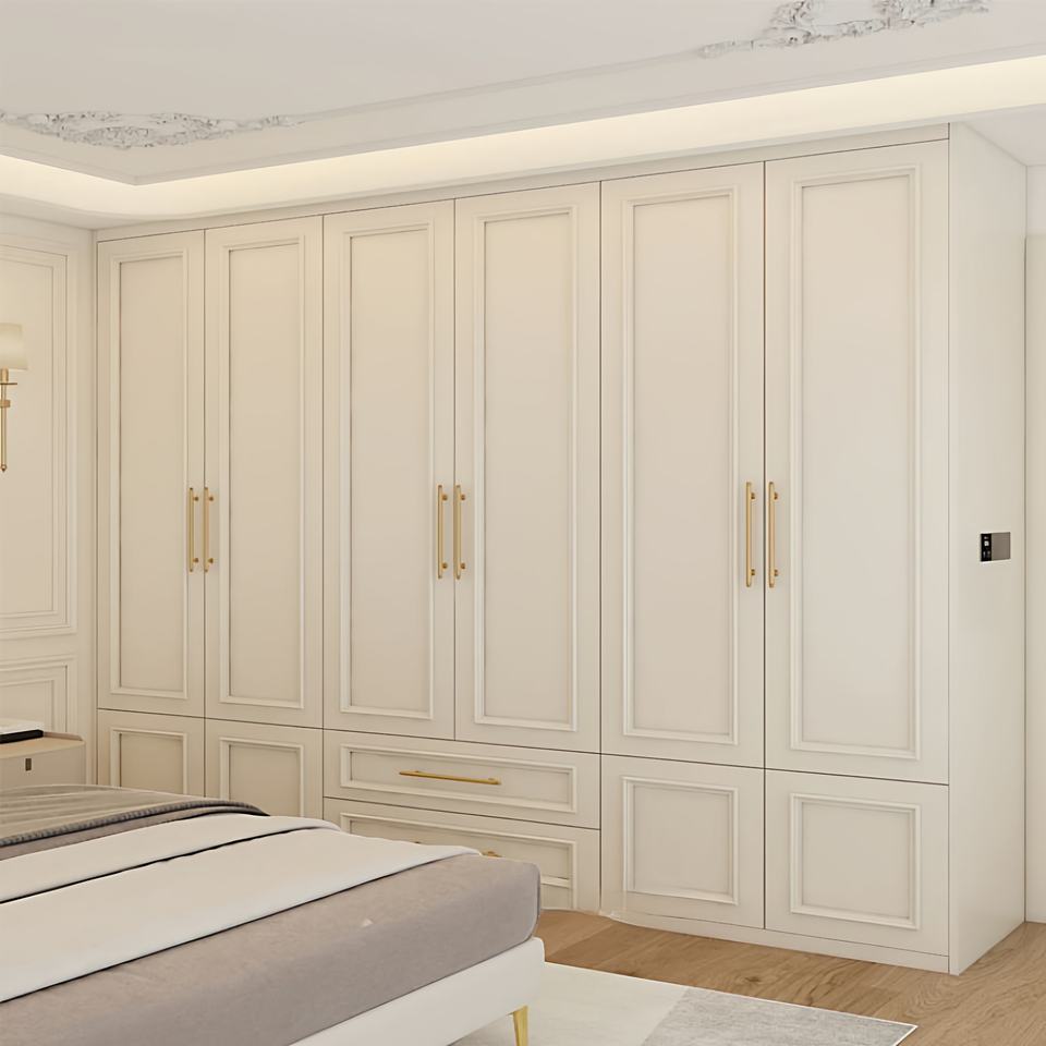 Armadi su Misura in Stile Francese-Americano Color Crema, Credenze Portabottiglie, Ante in Legno Massello, Cabina Armadio