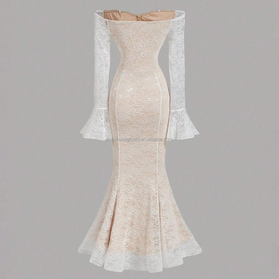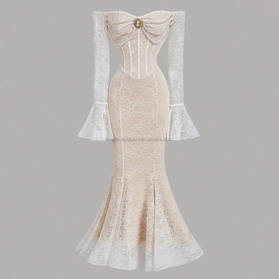 Abito Sirena Retrò Personalizzato con Spalle Scoperte e Pizzo per l'Autunno, Elegante Vestito Lungo da Cerimonia per Donne