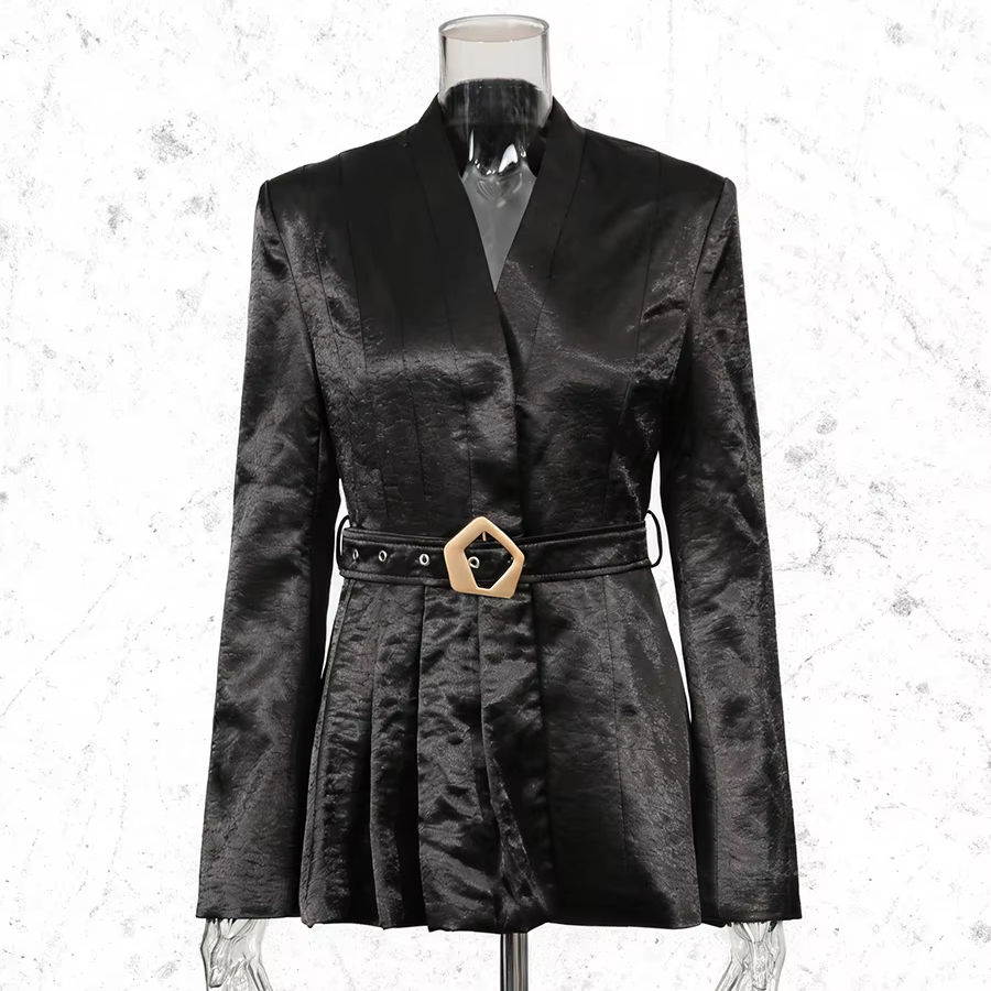 Blazer in raso di fascia alta da donna personalizzabile con cintura con fibbia di tendenza giacca abito sartoriale a spalla strutturata all'avanguardia