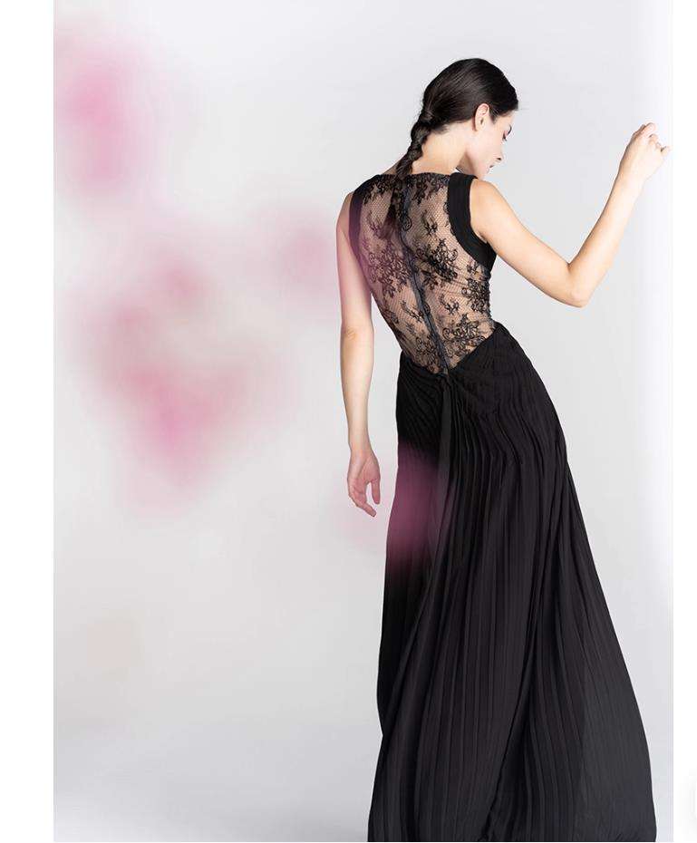 Abito Nero in Cashmere Personalizzabile per Giovani con Design Distintivo a Pieghe, Elegante Schiena Scoperta, Scollo a V Profondo, Asciugatura Rapida, Lunghezza a Terra A68