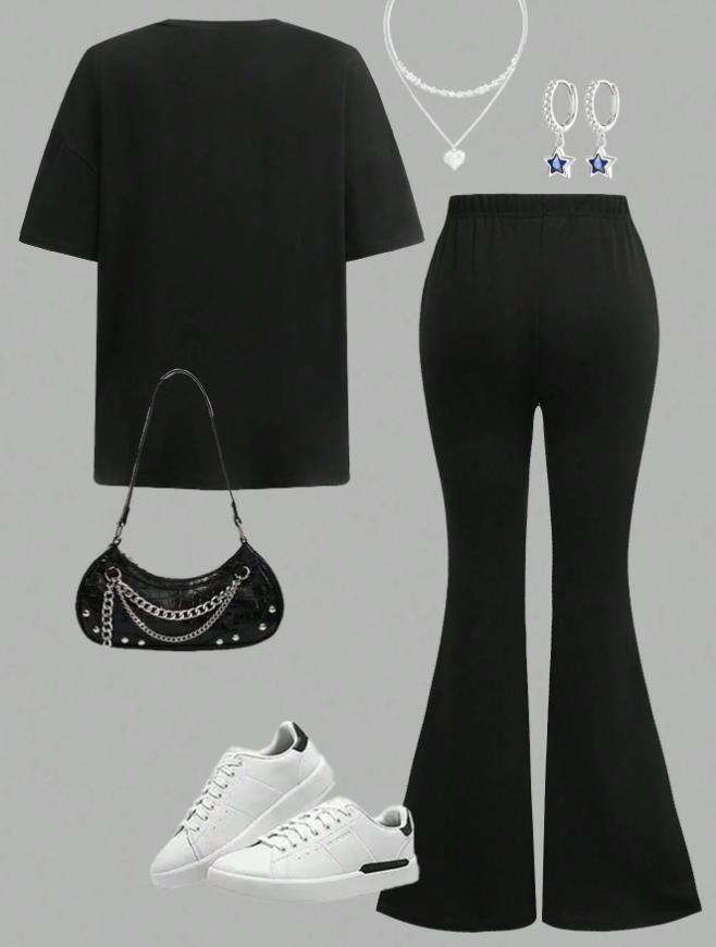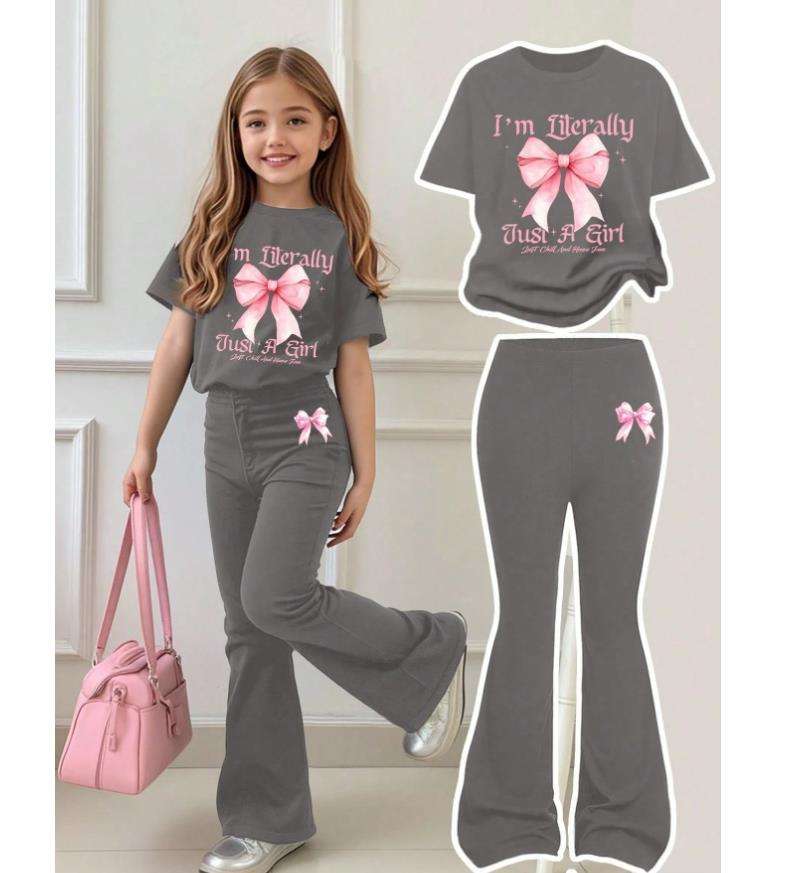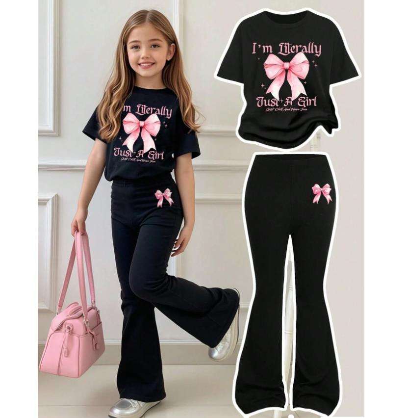 Completo Elegante Personalizzato per Bambina: T-Shirt Casual con Fiocco e Pantaloni a Zampa, Abbigliamento Scolastico Estivo 4-7 Anni