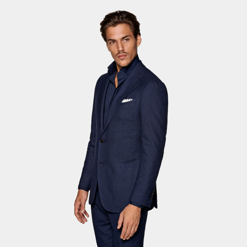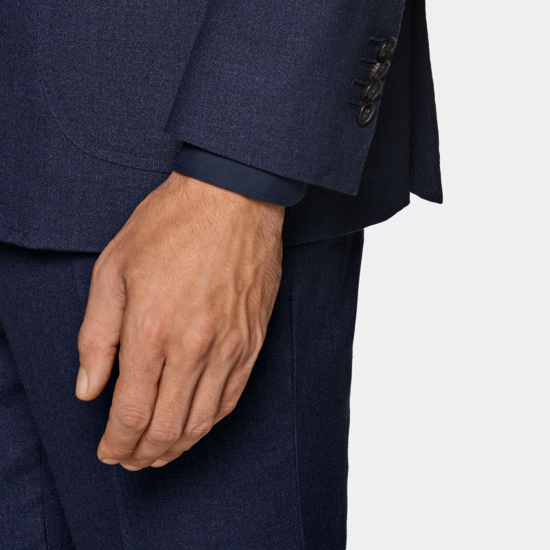 Abito Monopetto da Uomo Personalizzabile OEM Blu Navy Taglie Forti in Lana Seta e Lino, Slim Business Casual Multi-trama
