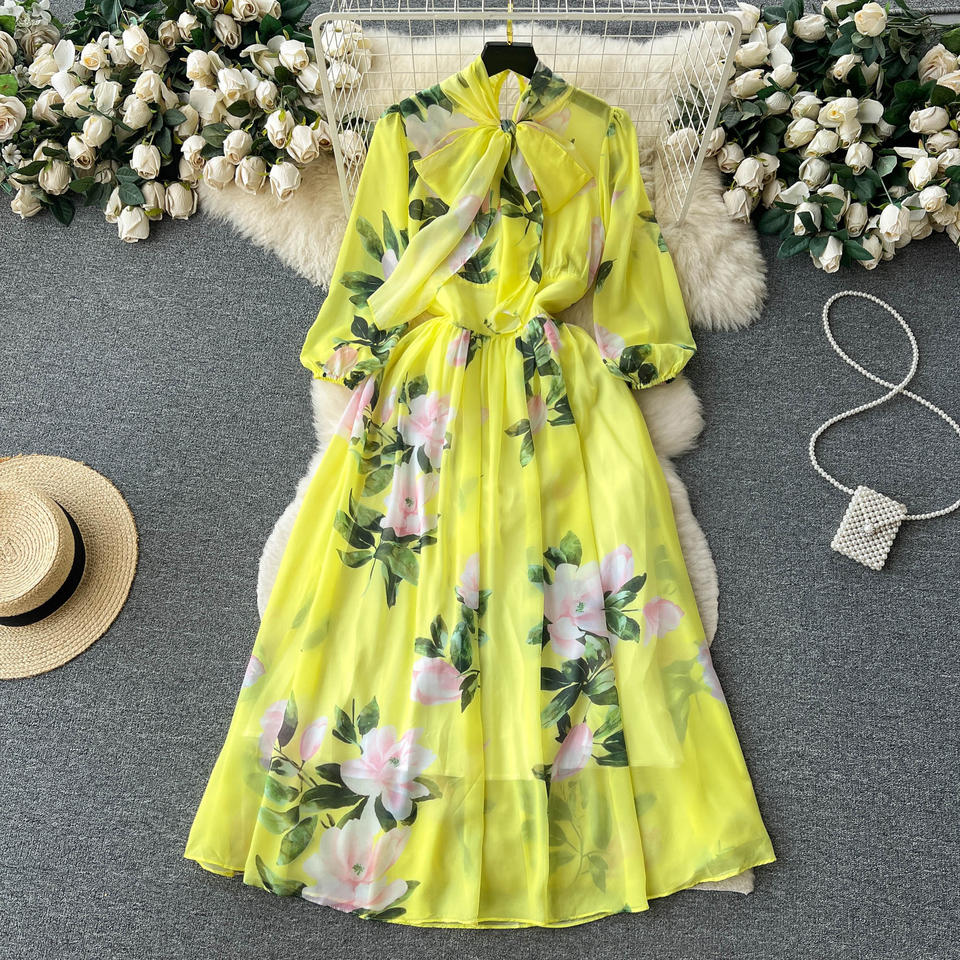 Customized Bow Tie up Waist Show Thin Super Yellow Floral Chiffon Printed Dress Women