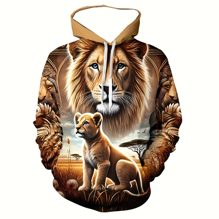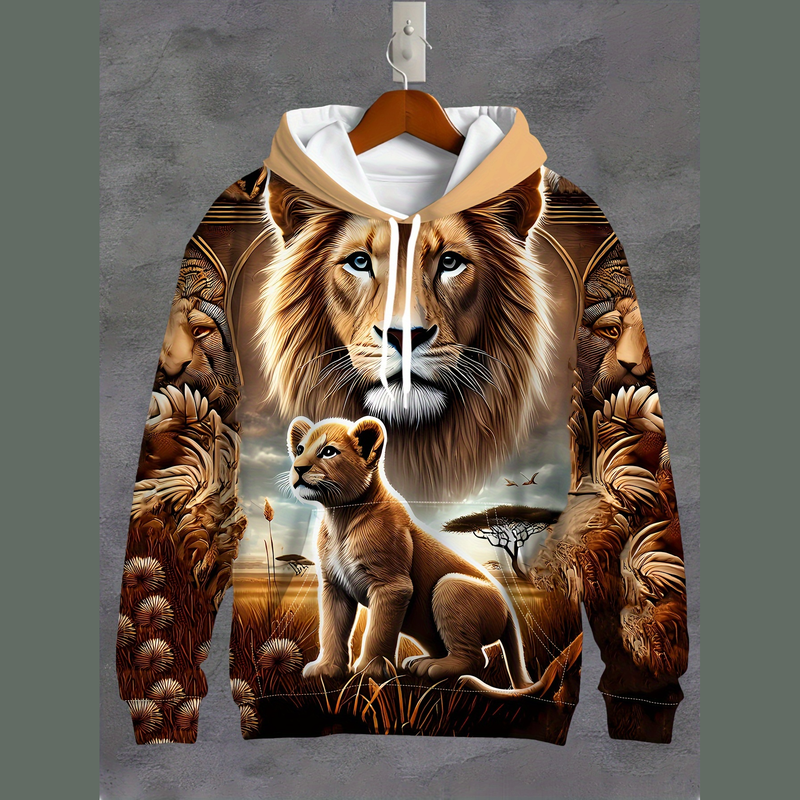 Felpa con Cappuccio Personalizzata con Motivo Leone Cartoon Stampato in 3D e Chiusura a Coulisse