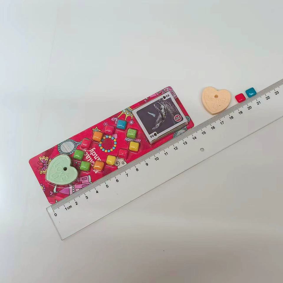 Descrizione del prodotto:Caramelle a forma di cuore 3,5 g, gomma da masticare 3,3 g, 10 carte da gioco