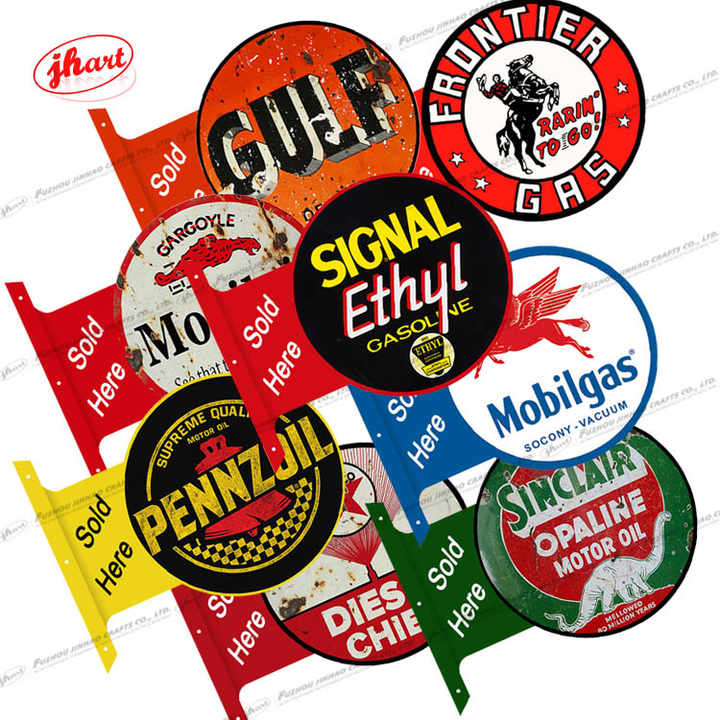 Targa in Metallo Rotonda Personalizzata con Stampa UV su Entrambi i Lati 'Gasoline Motor Oil Sold Here' per Decorazione di Garage, Bar e Man Cave