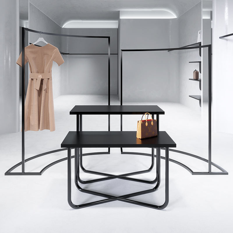 Negozio di abbigliamento in metallo di moda personalizzato che si adatta al negozio al dettaglio di abbigliamento per uomo espositore per vestiti neri