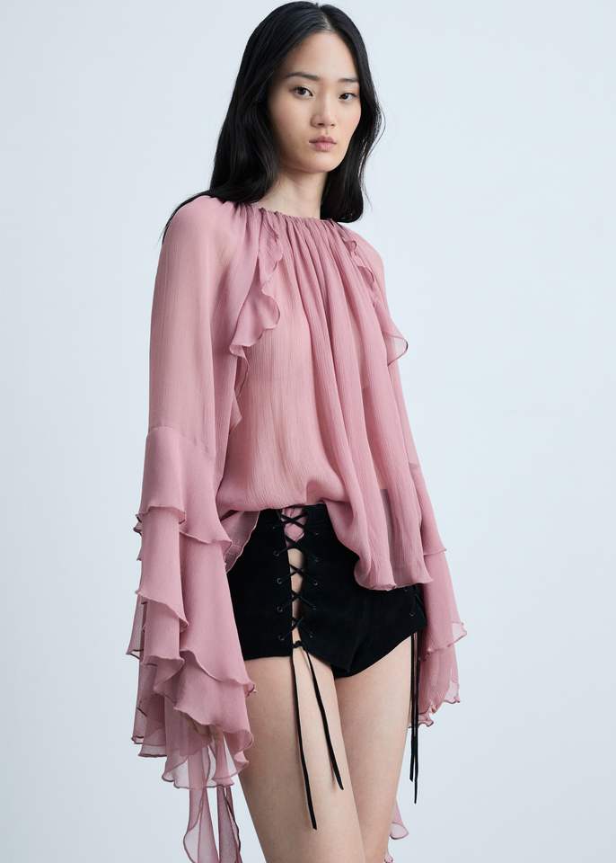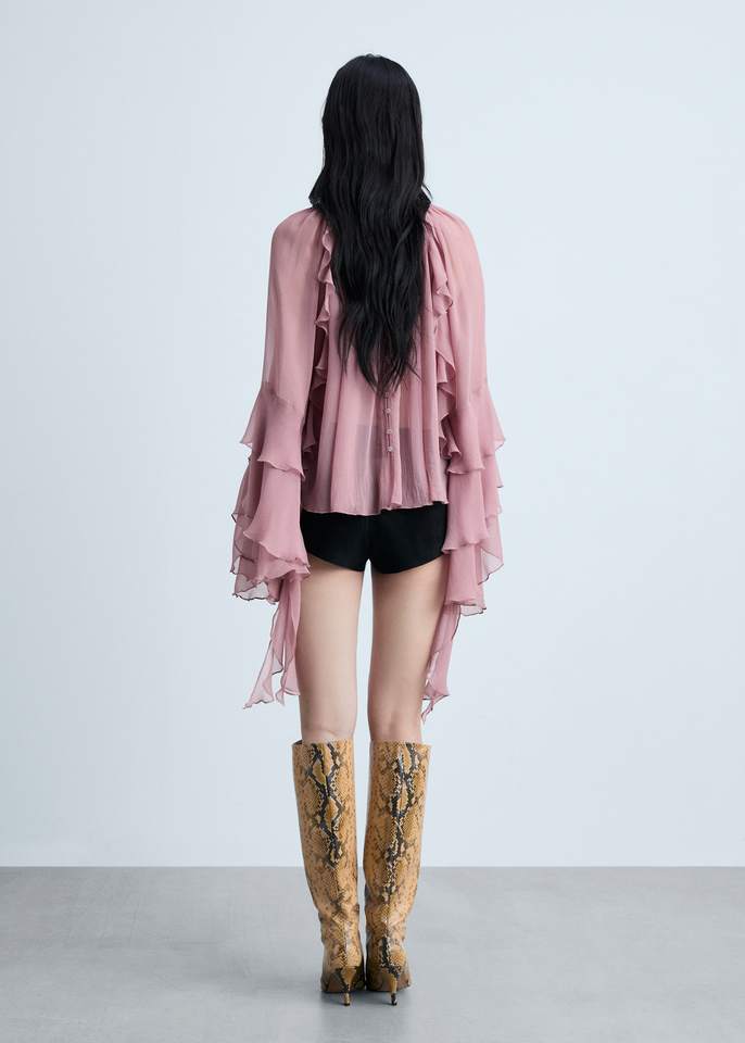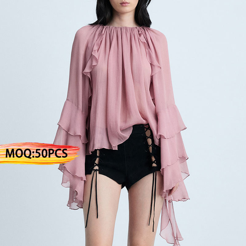 Blusa da donna in Chiffon rosa semitrasparente da donna