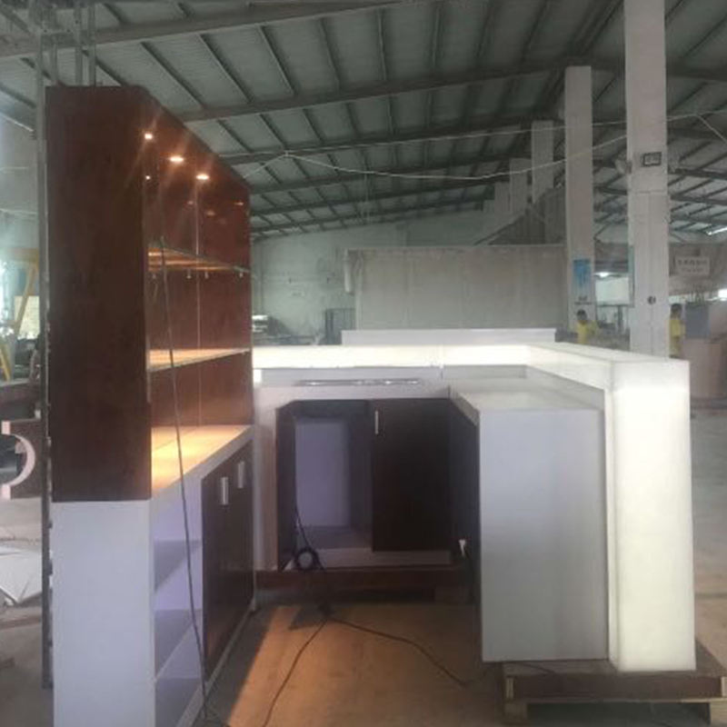 Bancone Bar a L Luminoso Personalizzato di Alta Qualità con Mobiletto Posteriore e Mensola