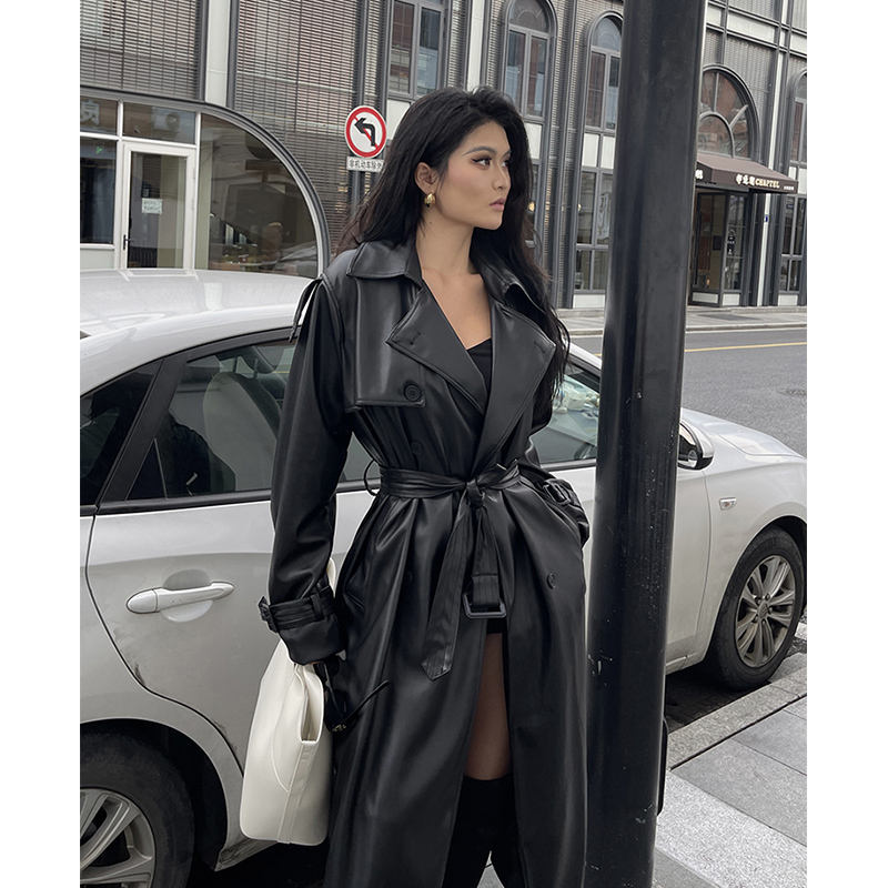 2024 con Logo personalizzato alta moda europea Trench lungo in pelle sintetica da donna a doppio petto ampio capispalla in ecopelle