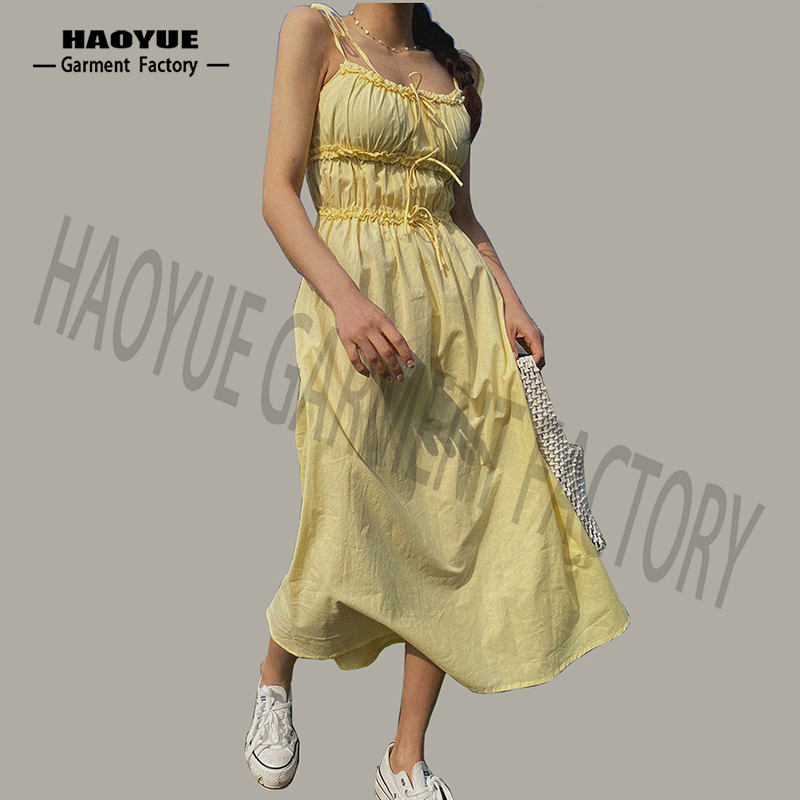 Customized Manufacturer Camisole Sherring Plain Chiffon Yellow Women's Casual Long Dresses