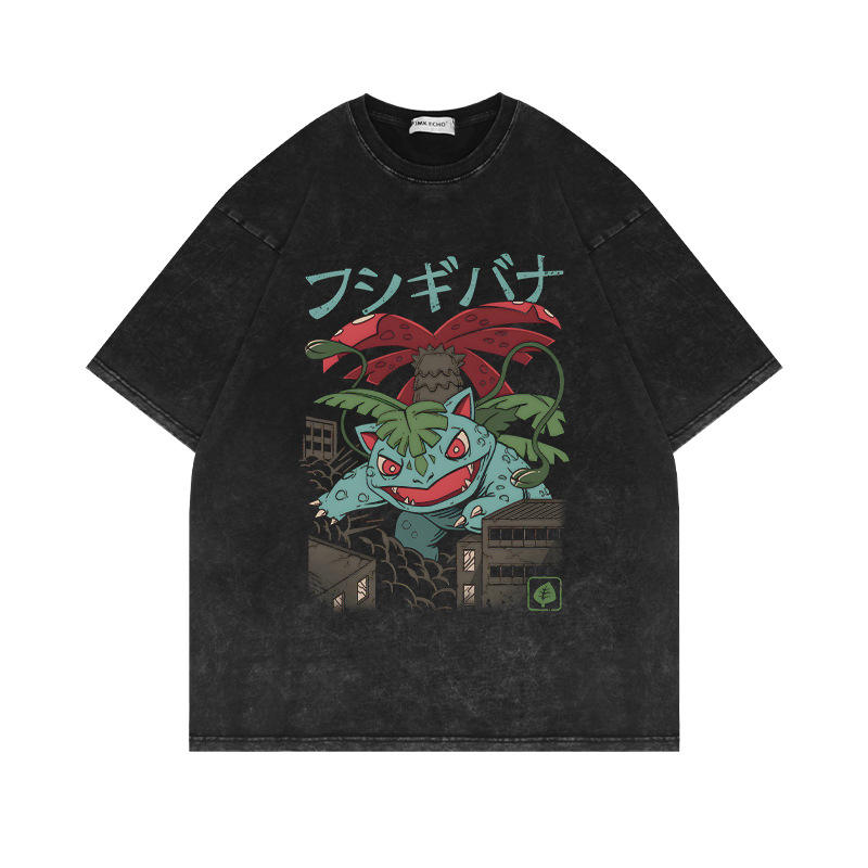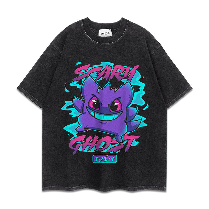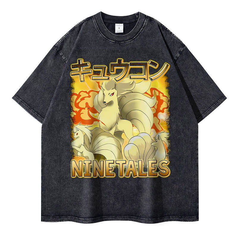 T-shirt da Uomo Personalizzata in Cotone 100% Nero Pesante 240 Grammi, Lavaggio Acido Vintage con Grafica Pokémon Pikachu Anime