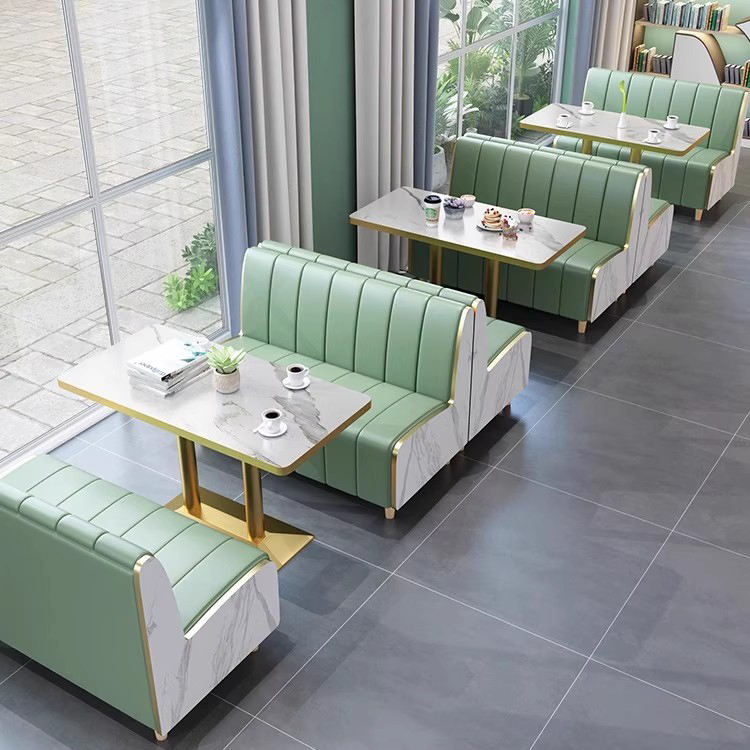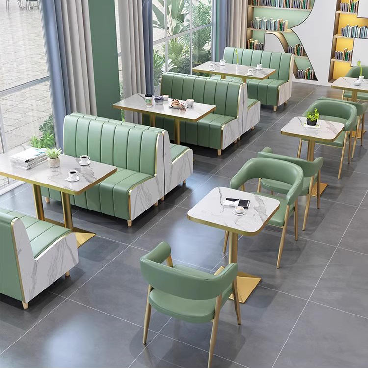 Set di Sedute in Pelle Personalizzato per Ristoranti Moderni, Tavolo da Pranzo con Motivo in Marmo e Sedie Dorate per Caffetterie, Bar e Hotel