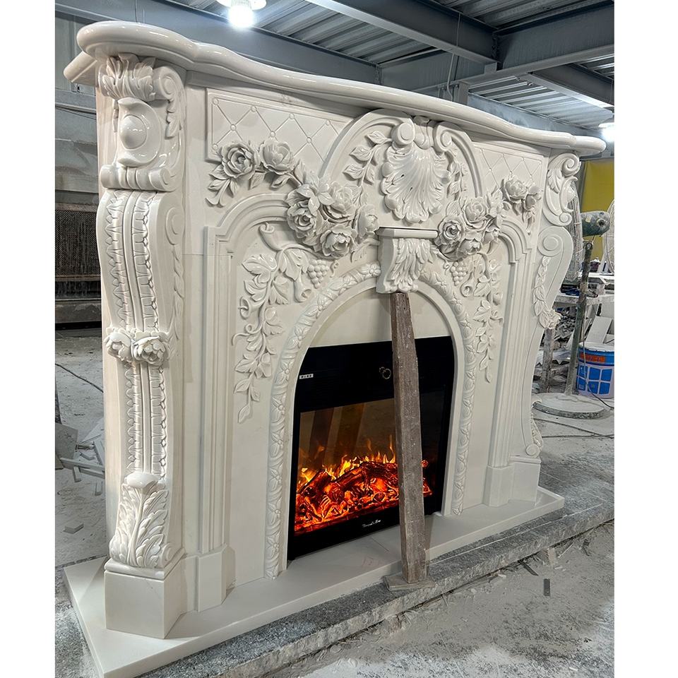Camino in pietra naturale in marmo bianco personalizzato con decorazione scolpita a mano intagliata in marmo mensola del camino