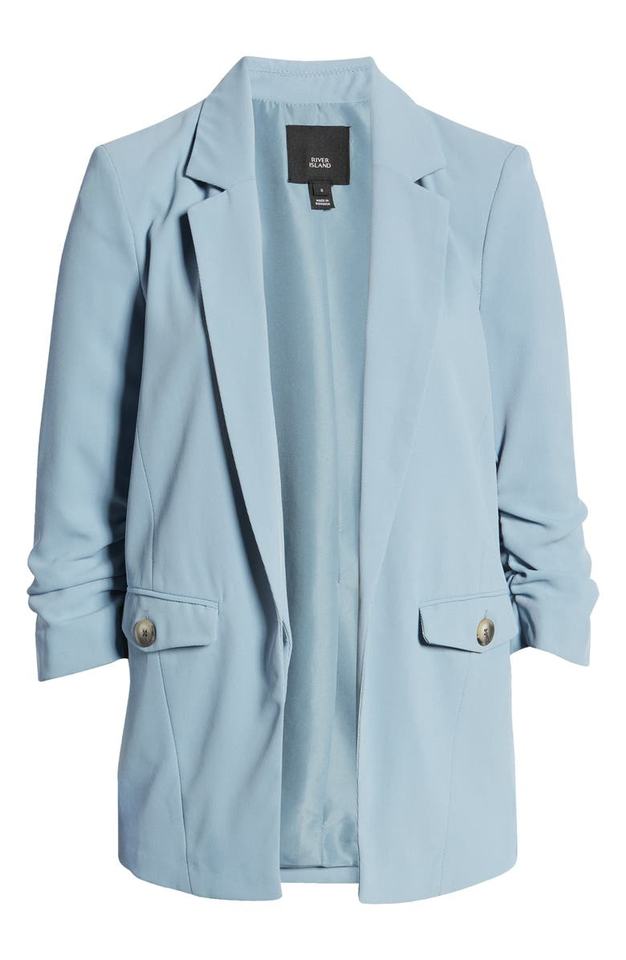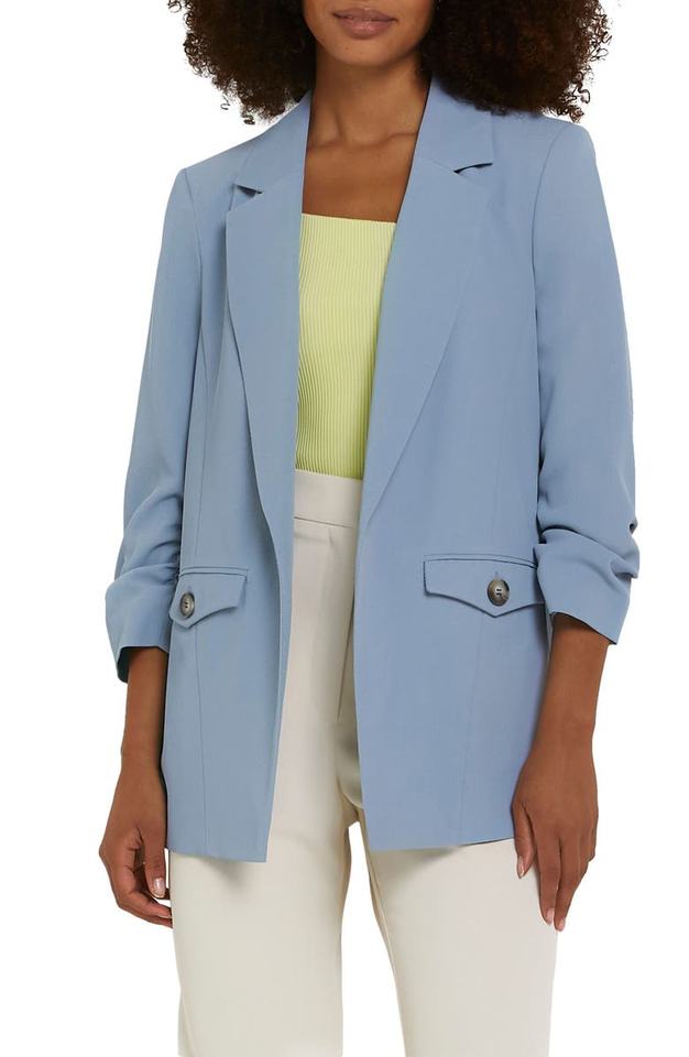 Nuova moda su misura di alta qualità classica con colletto intaglio a maniche lunghe davanti giacca chiara azzurra per le donne