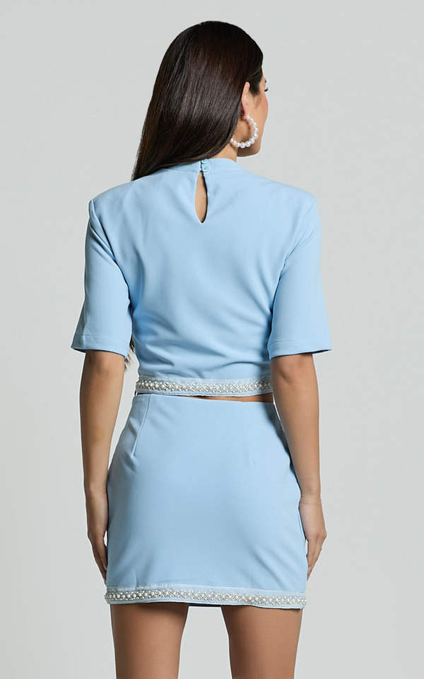Su misura O collo a maniche corte con perline e perline Mini gonna corta abbigliamento fabbrica Set da donna 2 pezzi