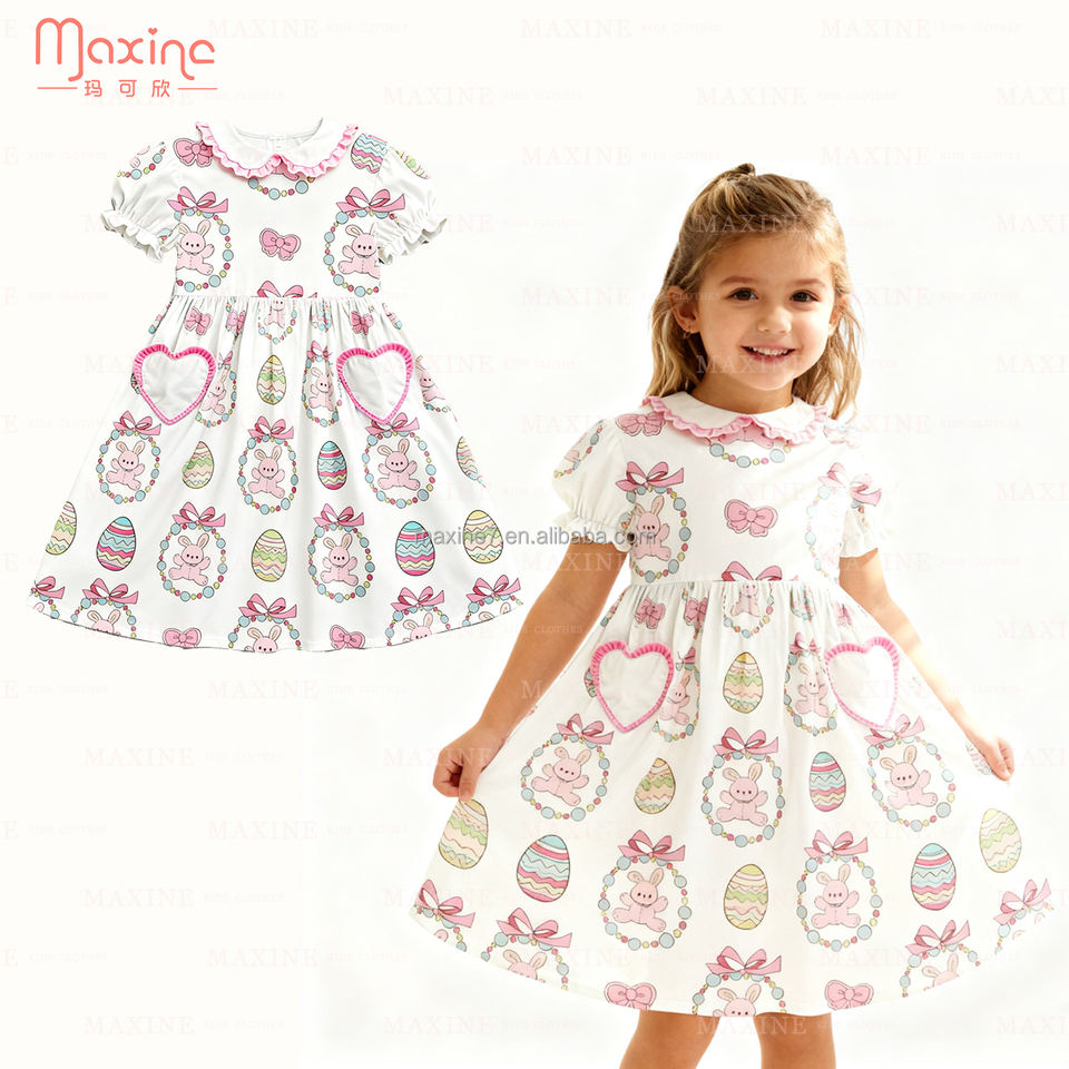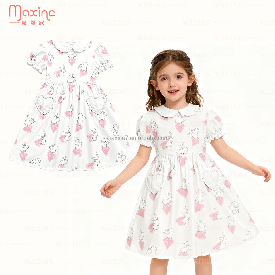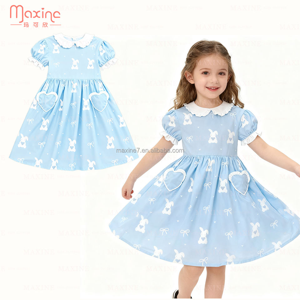 Abito personalizzato stampato da ragazza pasqua con colletto Peter Pan stampa coniglio abbigliamento per ragazze al ginocchio abiti per bambine