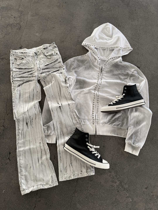 Set Personalizzato di Abbigliamento Streetwear: Felpa con Cappuccio Pesante con Strass e Cerniera con Rivetti, Pantaloni Larghi a Gamba Ampia
