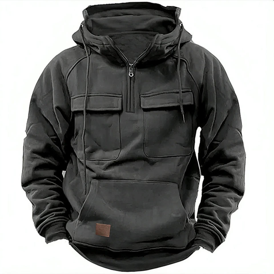 Felpa Invernale Personalizzata da Uomo con Cappuccio, Tinta Unita, Sportiva, Multi-Tasca con Inserti in Pelle