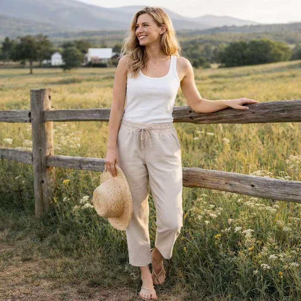 Pantaloni Corti da Donna Personalizzati in Puro Lino Beige con Vita Elastica e Coulisse, Vestibilità Ampia per Abbigliamento Femminile