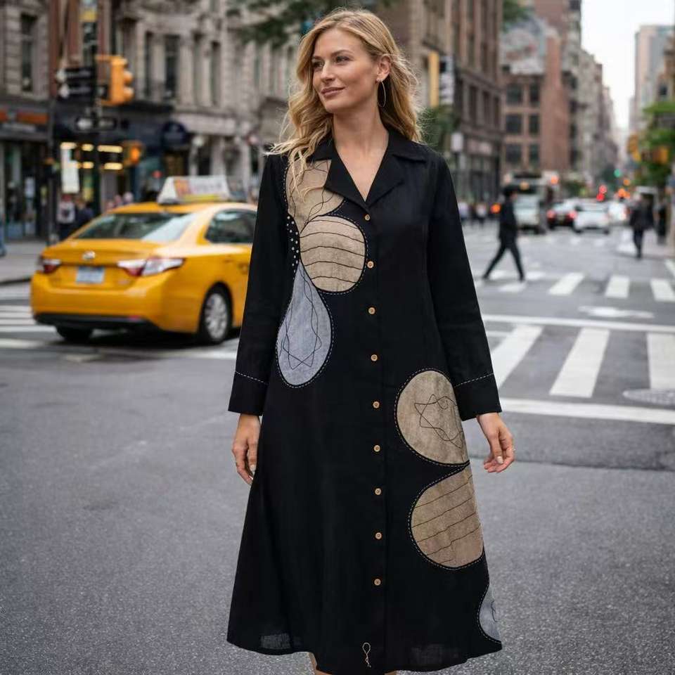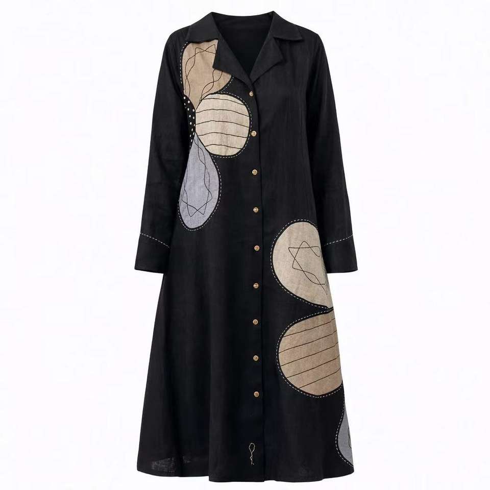Abito chemisier midi da donna personalizzato in lino e cotone nero con applicazione geometrica ovale, collo a revers dentellato e maniche lunghe, alla moda e casual