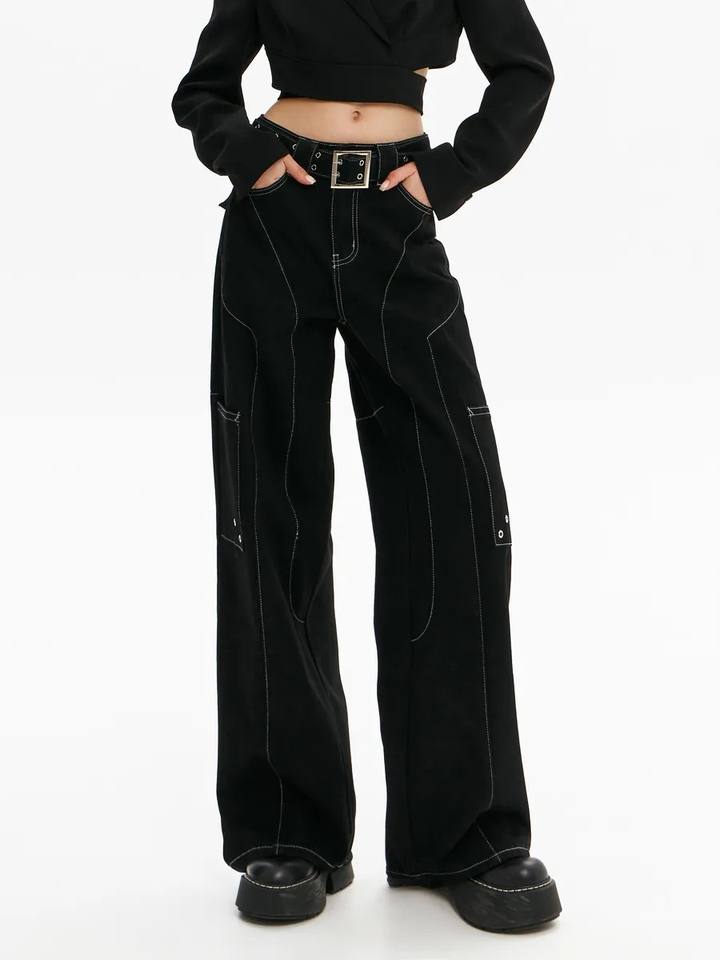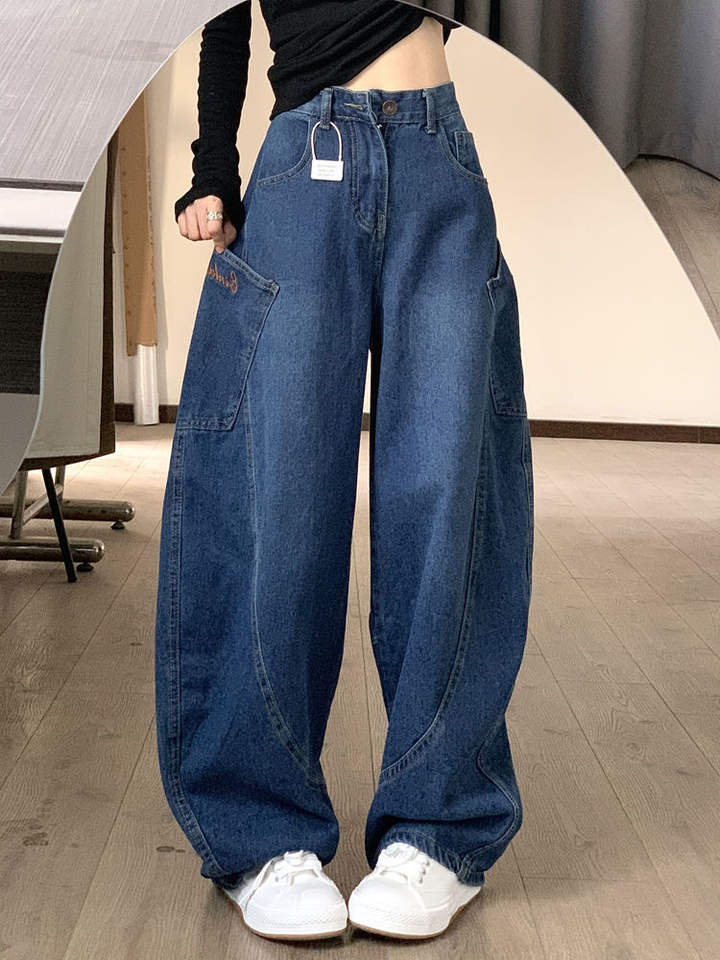 Jeans Larghi da Donna Personalizzati in Denim di Cotone Scuro Effetto Invecchiato, Vita Alta, Gamba Larga, Stile Retrò Streetwear con Bottoni e Curve