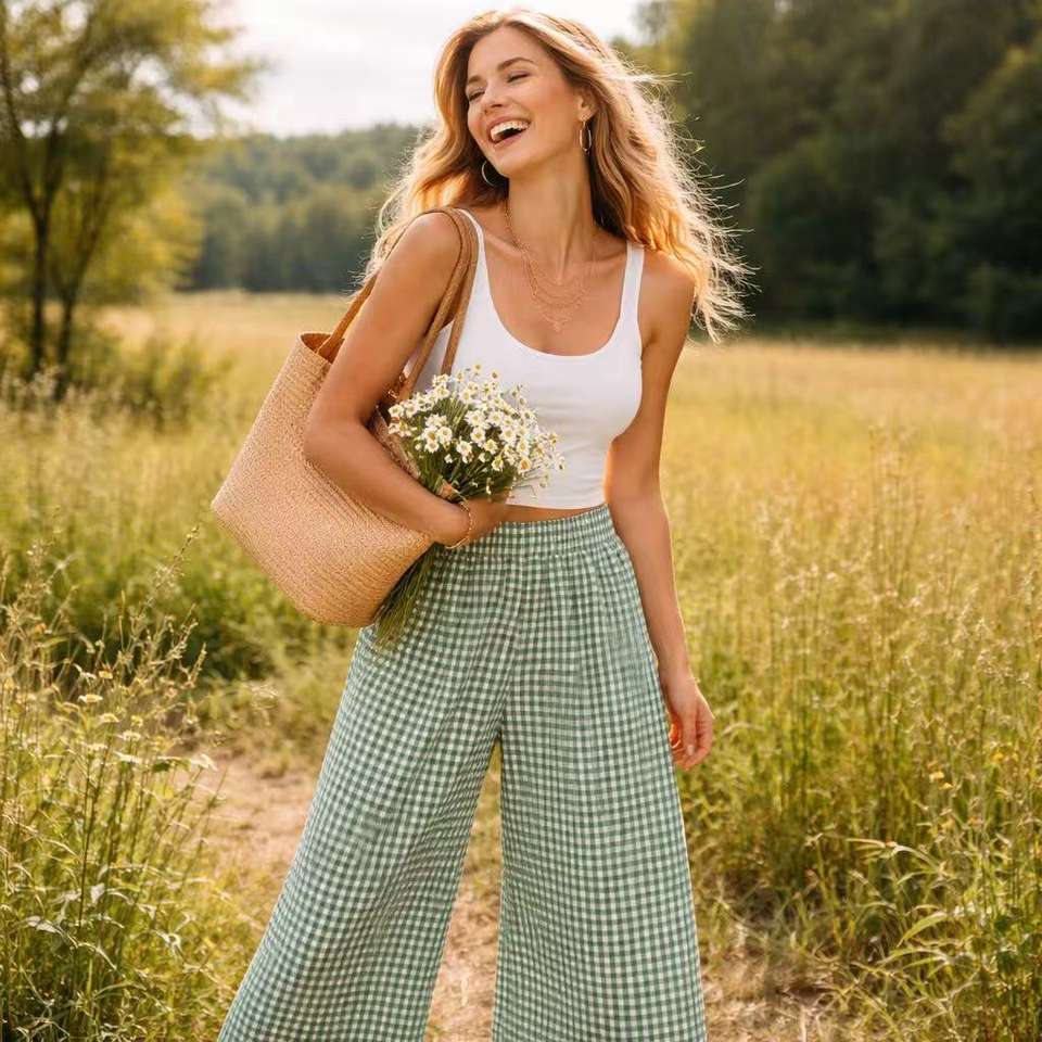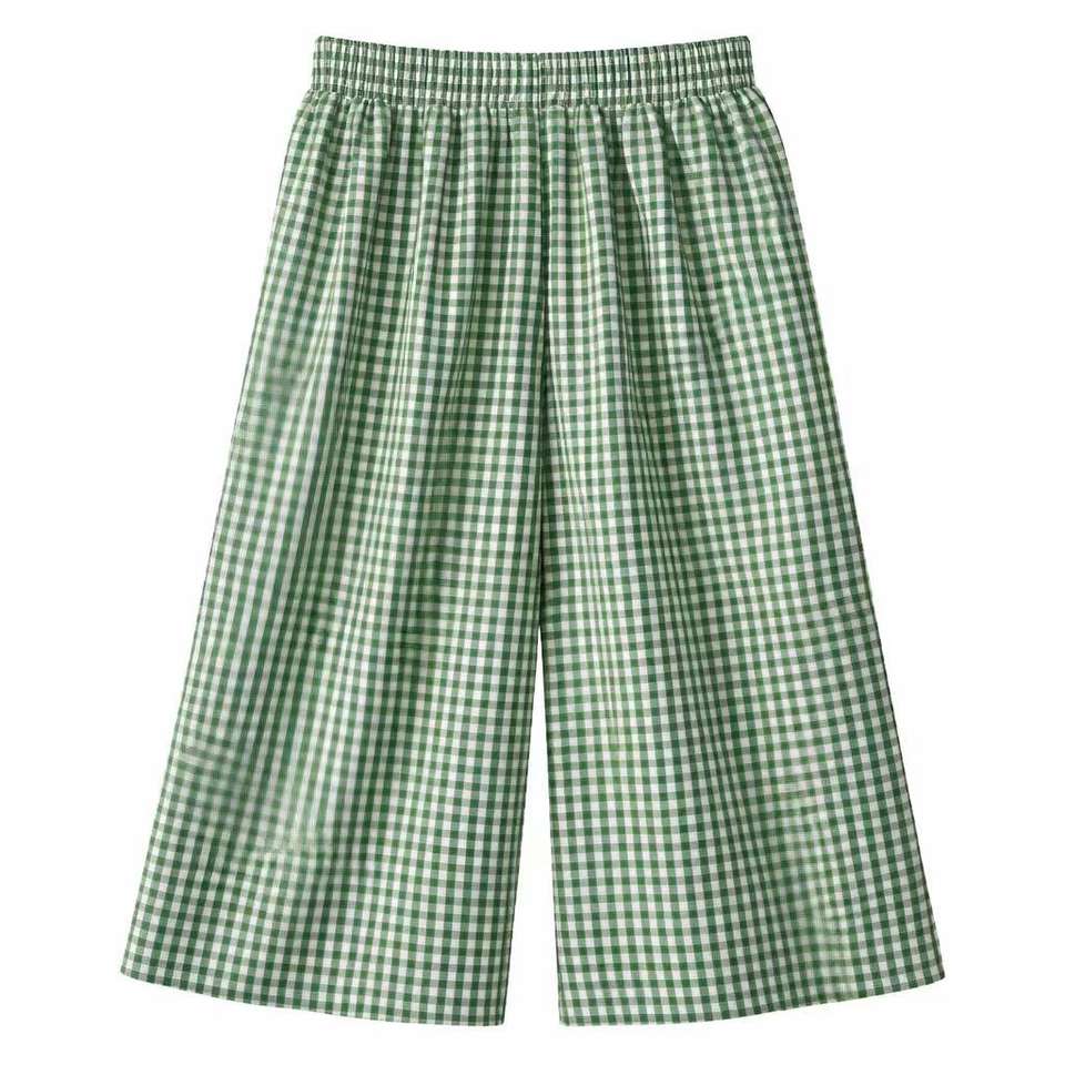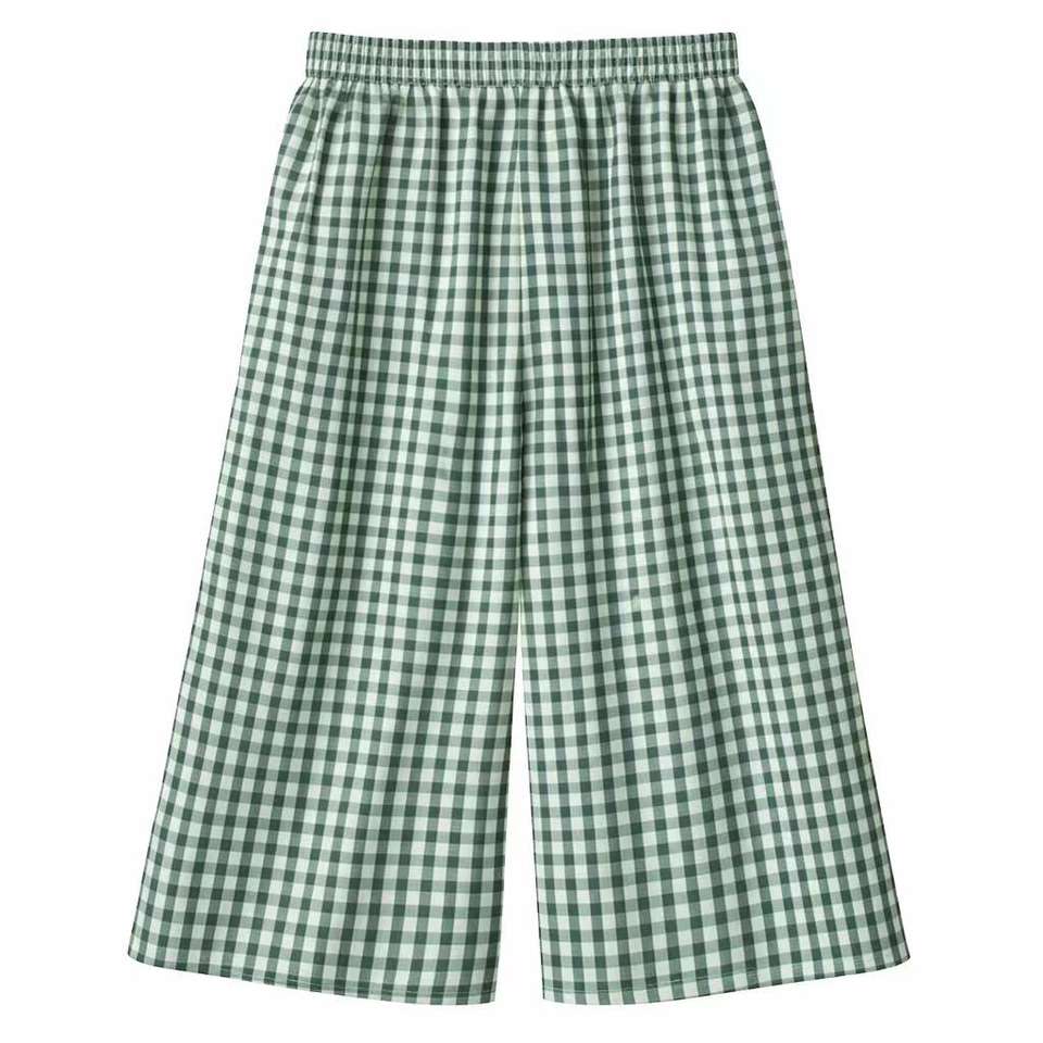 Culottes Personalizzate da Donna in Puro Lino Verde a Quadretti con Vita Elastica, Pantaloni Estivi Casual a Gamba Larga