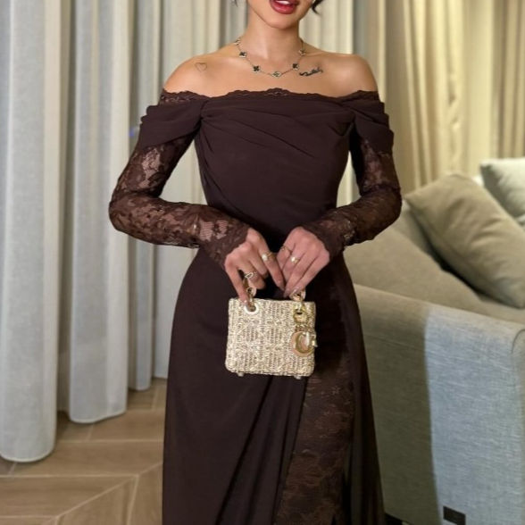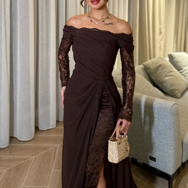 Su misura una linea Off spalla abito da ballo da sera donne Saudi Dubai abiti da sera con spacco laterale abito da sera a maniche lunghe in pizzo marrone