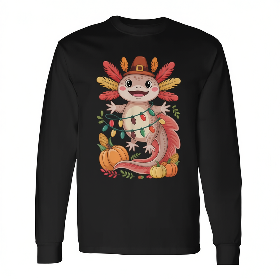 Simpatica maglietta a maniche lunghe con stampa di Axolotl per il Ringraziamento, con cappello da pellegrino e luci natalizie