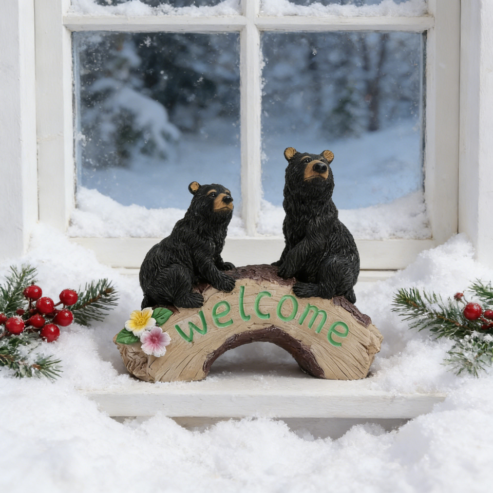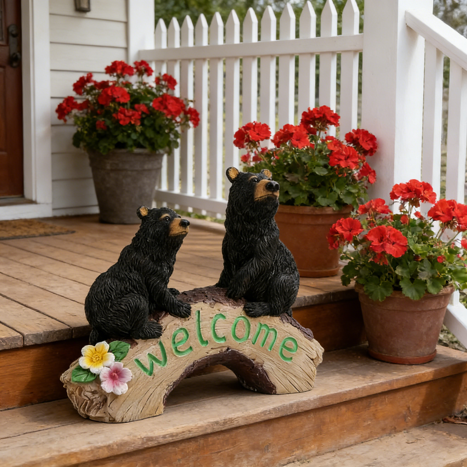 Cute Black Bear Welcome Garden Statue,Realistic Resin Bear Pair Sitting on Wood Bridge with "Welcome" Sign,Colorful Flower Decor