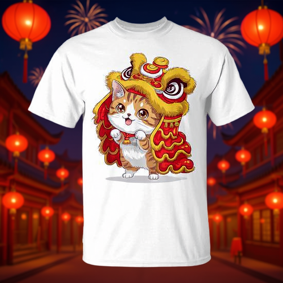 T-shirt con simpatico gatto kawaii che balla il lion dance per il Capodanno cinese 2025