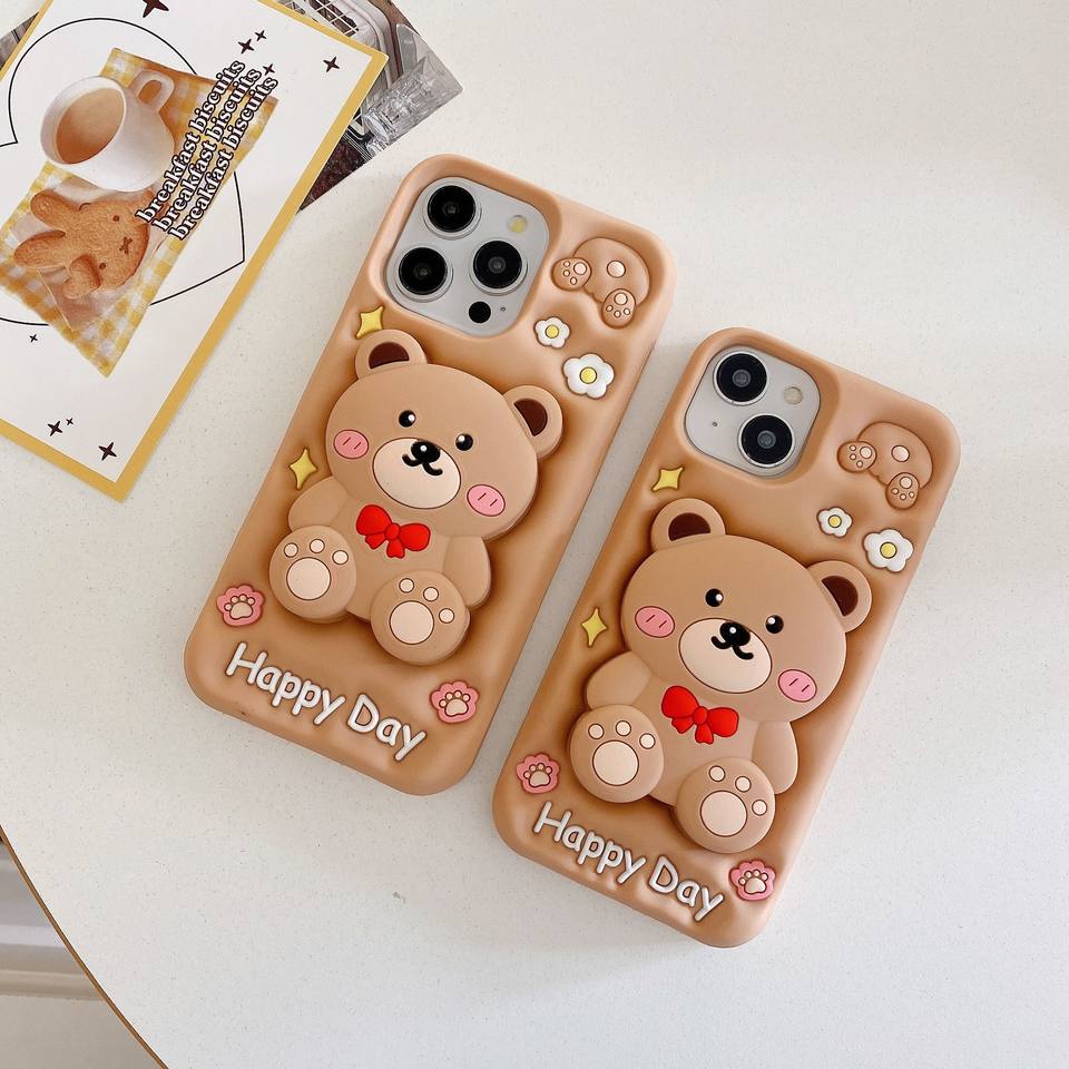 Cute Cartoon Silicone 3D Holder Bear Mobile Phone Case for iPhone 11 12 Pro Max 13 14 15 16 Plus Girls Mobile Phones Cover