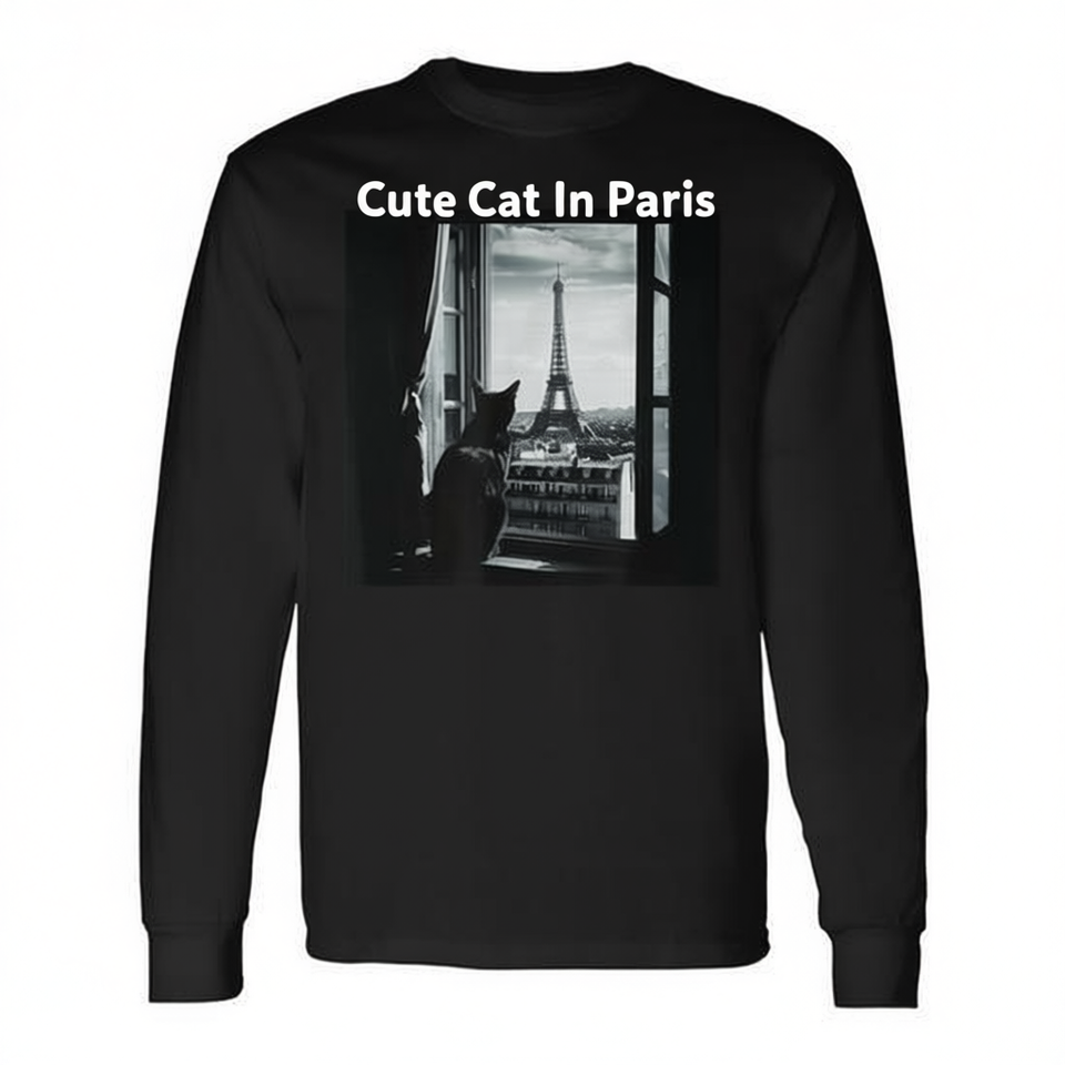T-shirt a maniche lunghe con simpatico gatto a Parigi, design grafico nero, per uomo e donna, unisex